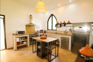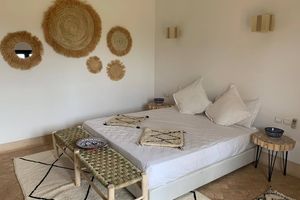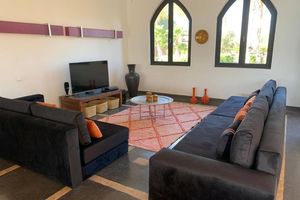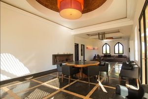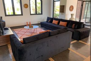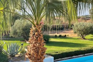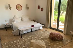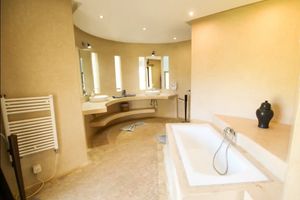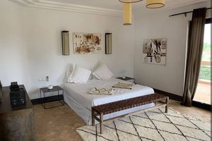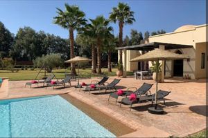 Magnifique villa de 600m2 sur plus de 1 hectare de terrain arboré. Située dans un domaine résidentiel à la campagne dans une oliveraie, sans vis à vis. 4 chambres spacieuses avec chacune leur salle de bains avec baignoire et douche. Piscine et hammam privé. Cette villa est située au km19 route de Fès, après 5 minutes de piste, calme absolu et dépaysement total garanti. Temps de trajet :